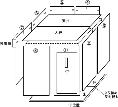 防音室は組立図を基にして、各パネルを組立時と同じ位置に配しますと再組立が出来ますが、パネルの重量があるため、スムーズな組立作業、及び安全性確保のために、実際の作業【運送・組立設置・分解・移設】は提携の運送会社が実施しています。 組立方法は、ドアの位置によって異なります。下記は一例になりますので、ご注意ください。 |
